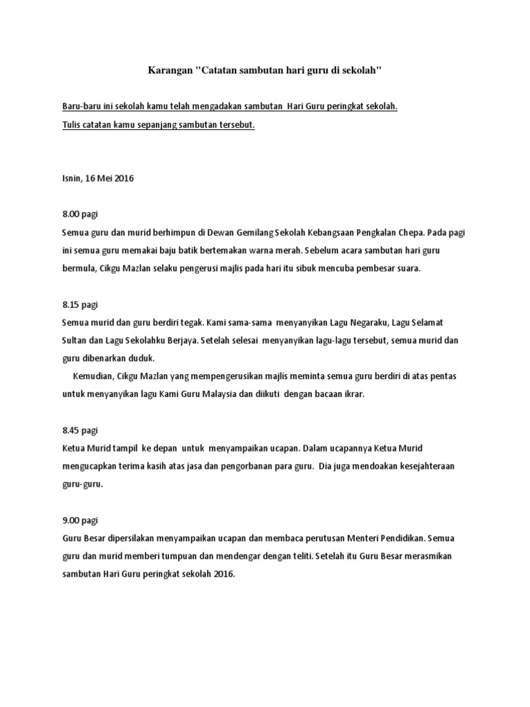 Sambutan Hari Guru diraikan di setiap sekolah. Enamstandard kandungan 32 menulis huruf suku kata perkataan frasa dan ayat secara meknis. Contoh karangan sambutan hari guru Pada 16 mei yang lalu sekolah saya iaitu Sekolah kebangsaan Taman BersatuKuala Kedah telah mengadakan majlis sambutan Hari guru peringkat sekolah dengan meriah sekali.